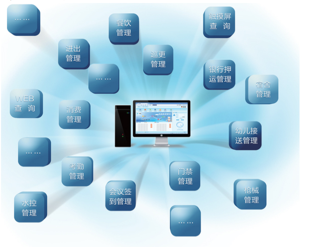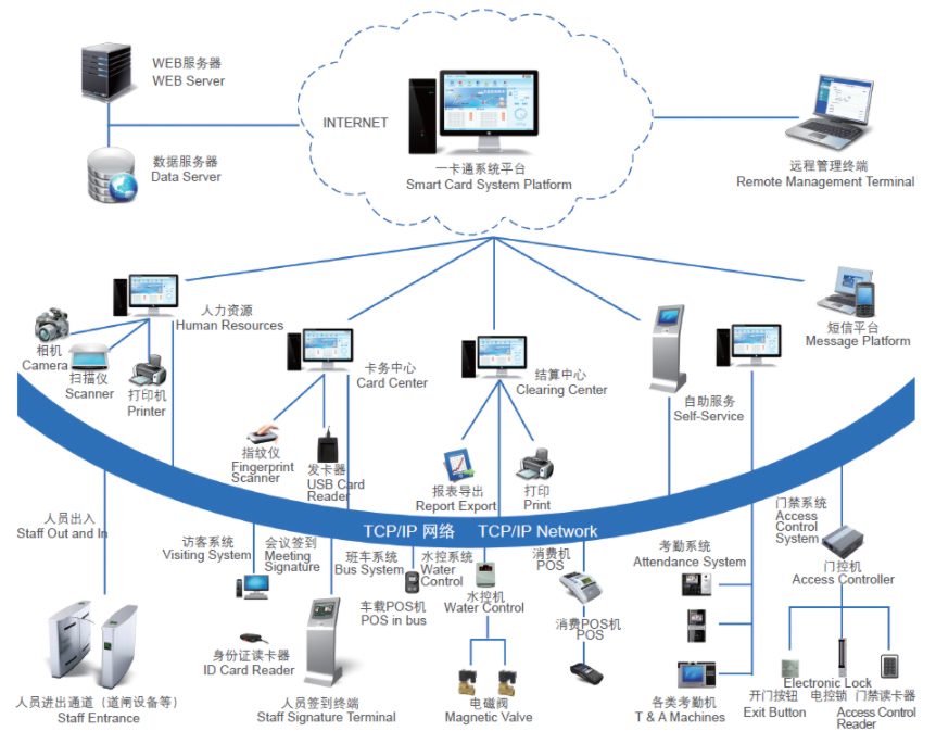 系統(tǒng)以一卡通管理系統(tǒng)為核心,通過網(wǎng)絡連接各功能模塊構成系統(tǒng)的基本框架,由于系統(tǒng)按模塊設計,可根據(jù)管理和發(fā)展的需要量體裁衣,分步實施,任意增減功能和擴充規(guī)模。